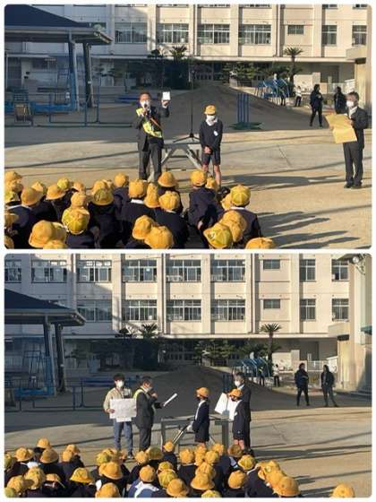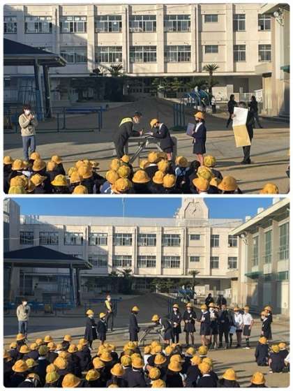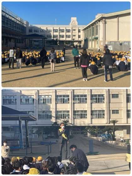 12月に入り寒さが厳しくなりましたが、晴天の中、全校朝会をおこないました。