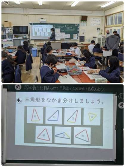 3限に3年2組で算数「三角形と角を調べよう」の研究授業をおこないました。