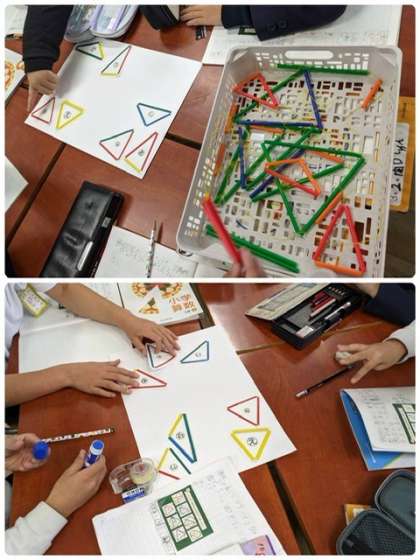 児童たちが作った三角形を仲間分けをする活動でした。長さによって色分けされている三角形の辺に着目することで3つの仲間に分けることができ、二等辺三角形と正三角形について理解を深めました。