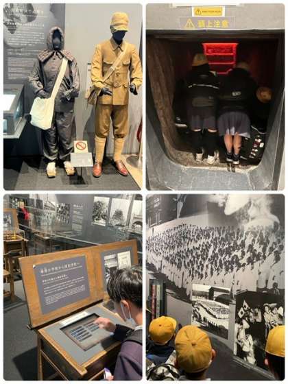 「ピースおおさか」では、戦時中や戦後の資料がたくさん展示されていました。戦時中の暮らしや当時の人々の思いが綴られた手紙や日記などを見学しました。再現された防空壕の中に入ったり、戦争を体験した方の話の映像を見たりする中で、戦争の恐ろしさを改めて感じている様子でした。最後に学童疎開の映画を視聴しました。自分たちと同世代の子どもが体験している話だったため、児童たちは真剣に見ていました。