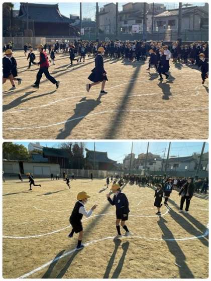 縦割り班に分かれて運動場の両側に並び、一人ずつラインの上をケンケンをして進みます。出会ったところでじゃんけんをし、勝ったら進み、負けたら次の人が出てきます。相手の陣地までいけば勝利です。それを何度も繰り返します。寒いので待っている人も次の準備をしながら「グー・チョキ・パー」とジャンプします。