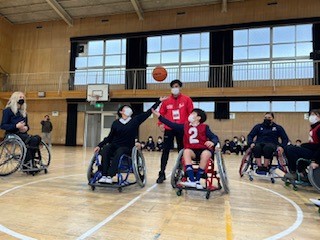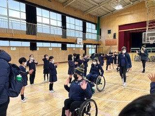 オーストラリア女子車イスバスケットボール選手団と車イスバスケットボールを通じて交流しました。競技用の車イスを見るのは初めてという子どもたちが多く、終始興奮した様子でした。競技用車イスにはブレーキがなく、腕の力でコントロールします。迫力あるプレーに圧倒されていました。英語での挨拶や横断幕作りと、この日を心待ちにしていた子どもたち。貴重な時間を過ごすことができました。オーストラリア代表のみなさんありがとうございました。