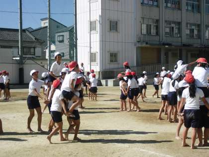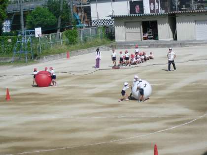 5・6年生の「騎馬戦」と3年生の「大玉ころがし」の練習の様子です。