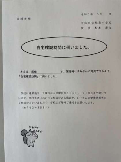 本日より19日(金)までの間に、学級担任が緊急時に速やかに対応ができるように自宅確認に伺います。その際、このような手紙をポスティングさせていただきます。