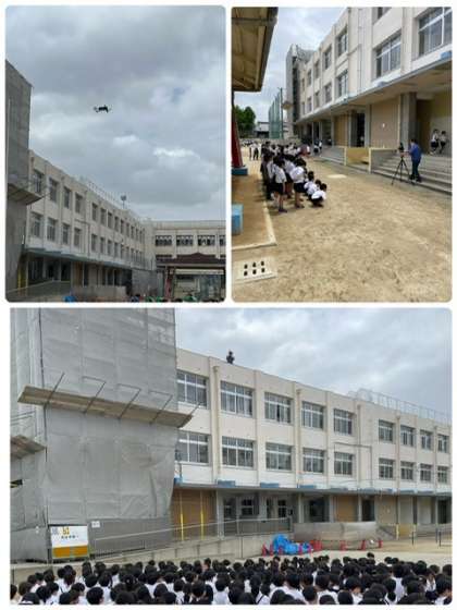 運動場に全児童・教職員が集まり、一人一人が緑・赤のボードを持ち「城東」の文字を作りました。撮影はドローンを使って、上空から撮影しました。