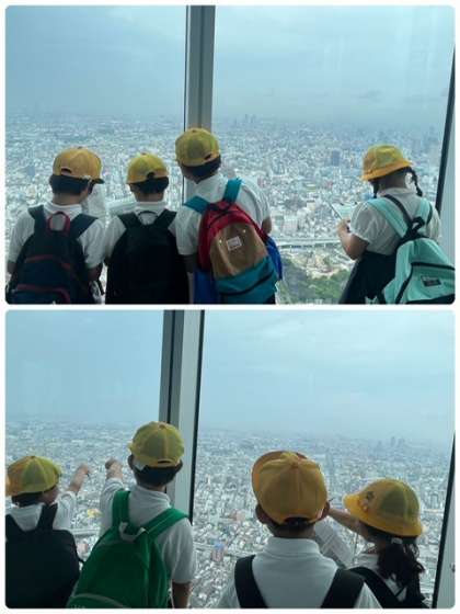 当日は少し天候が悪く、展望台から良い景色が見られないかと心配していましたが、霧もなく、大阪市内を一望することができ、天王寺動物園や大阪城を見つけると児童たちはとても喜んでいる様子でした。