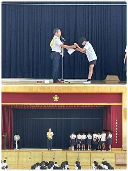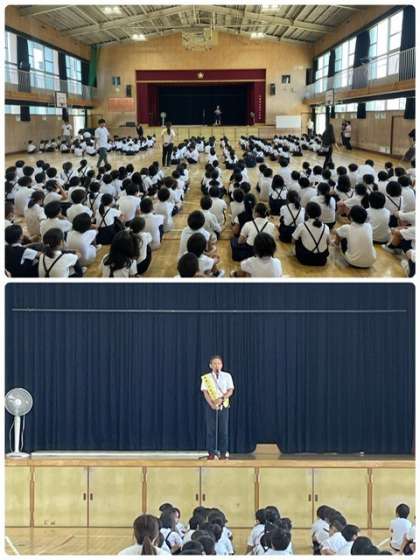 校長先生からは最近気温が高くなる日が続いているので、熱中症にならないためには睡眠・栄養・水分をとることが大切ということ。そして、もうすぐ夏休みということで、今のうちから夏休みに学習したいことやもっと伸ばしたいことを計画し、夏休みに実行することでさらに自分の個性に磨きをかけてほしいといった話がありました。