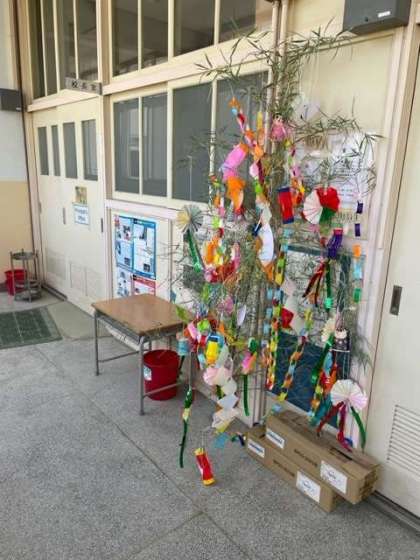 校長室前に飾っているので、前を通った児童たちは口々に今年の願い事をつぶやいていました。