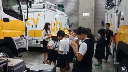 5年生が社会科の情報産業の学習で28日と30日の2日間に分かれて読売テレビ局の見学に行きました。報道番組放送用車両の見学や、情報番組が収録されるスタジオの中を見学させていただきました。テレビ局で働いている人々の工夫や様々な機材の取り扱いなどについて学習しました。楽しいテレビ番組をつくるために、たくさんの人たちが働いていること、照明やカメラ、様々なセットなどたくさんの機材を活用していることを学びました。