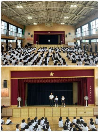 校長先生からはこの2学期から新しく城東小学校の仲間になった2名の転入生の紹介がありました。その後、バスケットボールW杯男子の試合で日本代表が強豪国に勝利したことを引き合いに、強い相手にも臆することなく向かっていく姿勢を見習い、自分たちにも生かしていって欲しいといった話や、一人ひとりの個性を大切にし、自分の良いところをもっと伸ばしていこうといったことや熱中症に気をつけるためにも生活リズムを整えて、無理をしすぎずに過ごそうといった話がありました。