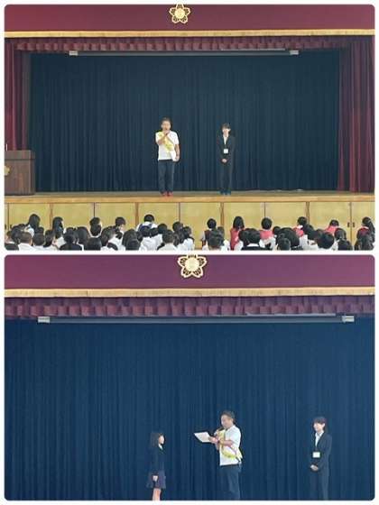 まずは校長先生から養護教諭の教育実習生の紹介があり、頑張った児童の表彰がありました。