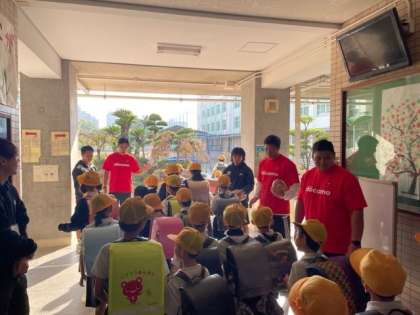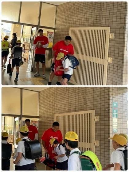 児童たちは校門をくぐる際に選手たちと元気よく挨拶をし、ハイタッチをしたり、時にはタックルをしたりして、少しいつもと違う朝の様子でした。