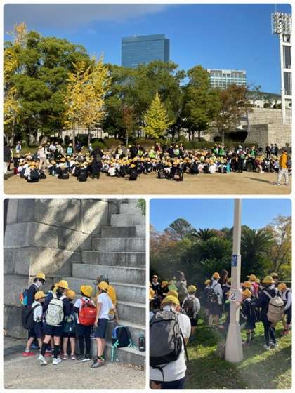 縦割り班に分かれ、児童たちが協力しあい、各ポイントにあるミッションをクリアしながら大阪城公園を周りました。