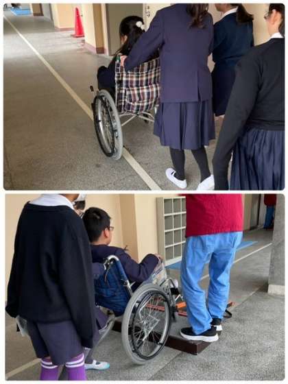 児童は車いすに乗っている児童のことを考えながら、慎重に押したり、少しの段差でも力を入れて介助しなければいけないことに驚いたりしていました。