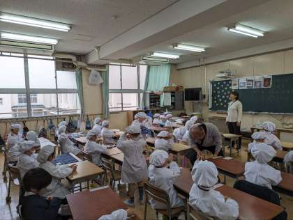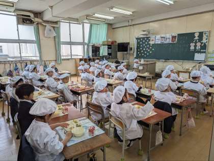 1年生は初めての小学校での給食を食べました。給食服の正しい着方をよく聞き、6年生の子どもたちが運んでくれた給食をとてもおいしそうに食べていました。終わりには自分たちで食缶を返しに行くことにも挑戦しました。