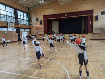 体育をする前にまずは音楽に合わせてダンスをしました。リズムに合わせて動くことで身体を温めるとともに、気持ちも高めて授業に積極的に参加できるようにしました。