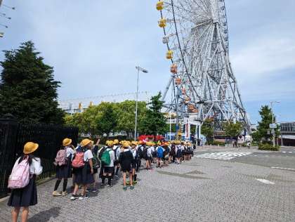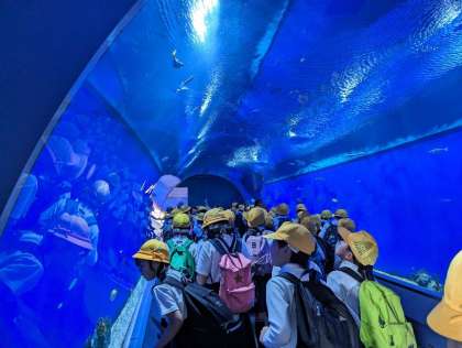 本日は4年生の遠足がありました。天気にも恵まれた中、海遊館へ向かって出発しました。海遊館の前で記念撮影後いよいよ入館しました。トンネル型の水槽を通るときには、自分達の上を魚が泳いでいる様子に歓声を上げていました。気づいたことや面白かったことを一生懸命メモしている子もいました。色々な生き物をグループで楽しんでみることができました。