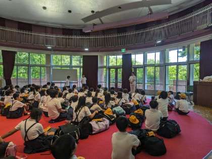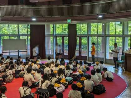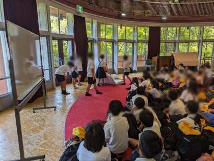 開舎式を行いました。スタッフの方からレクリエーションを受け、教頭先生からは体験に向けてのお話をしていただきました。