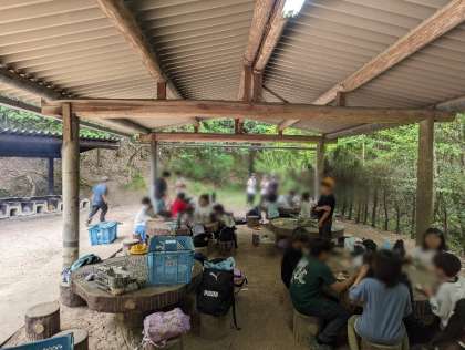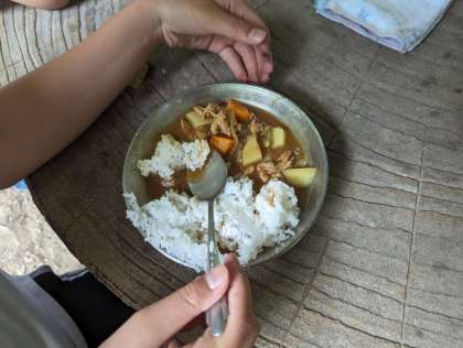 木から火を起こし、お昼ご飯のカレーを作りました。一生懸命自分たちで作ったカレーをとてもおいしそうに食べています。