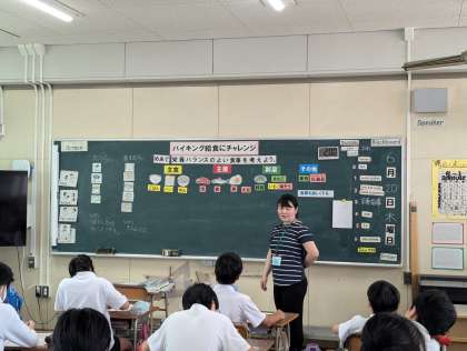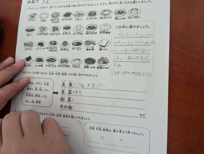 栄養教諭の方を招いて、普段食べている食事について考えました。はじめに一覧表から好きな食べ物を選んでみて、自分の作った献立のバランスに偏りがないか確かめました。赤黄緑の食物グループに分けた食べ物を元にして、改めて理想的な食事バランスに気を付けて献立を考えました。健康的な生活のために、自分が食べているものに興味関心を深めることができました。