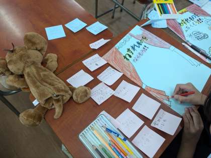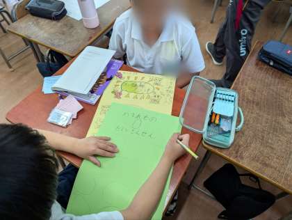 本日はポスター作りをグループでしました。事前に一度作ったポスターをグループごとに鑑賞し、子どもたち同士で良い点や改善点を伝えました。グループはその意見を参考により分かりやすいポスターを作っていました。意見の中からどの内容を使うか自分で選び、グループと話し合うことで、主体的・対話的な学習を行うことができました。