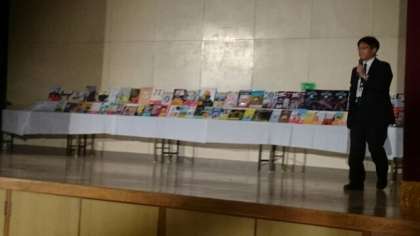 次に、1学期からお世話になっている図書館ボランティアのみなさんから、一言ずつメッセ−ジをいただきました。そして最後に『きんき教育文化財団』から寄贈していただいた本のお披露目をしました。約70冊の本が現れると、子どもたちは歓声をあげ、“早く読みたい”“新しい本に触りたい”と大喜びでした。