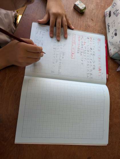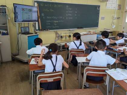 算数科の学習の様子です。kmを使って、道のりを表す学習に取組みました。1000mが1kmであることをもとにして、教科書に書かれた道のりをkmを使って表していました。1050mのような長さならどのように表すか、よく考えて答えることができていました。