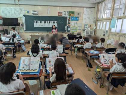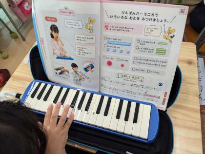 ピアニカの演奏の様子です。歌に合わせて自分の好きな音を出してみようということで、子どもたちは1つの音をしっかりと出してみたり、色々な鍵盤を同時におさえてみたりと色々な工夫をして楽しみました。音が鳴るたびにいい笑顔を見せてくれました