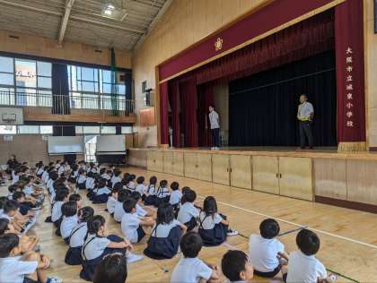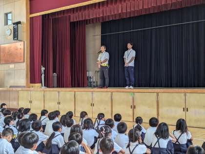 今日は全校朝会で現場実習に来られた先生の紹介をしました。主に教室で子どもたちの学習の様子を見て、小学校とはどのような場所なのかを学んでもらいます。子どもたちは目をキラキラさせてよろこんでいました。短い期間ですが、子どもたちとたくさんの思い出を作ってもらえればと思います。