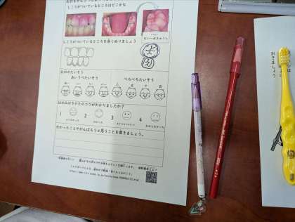 今日は歯みがきの方法について指導していただきました。歯みがきが大切だと知っていても、自分の歯に実は歯垢がついていると聞いて驚いている子がたくさんいました。染め液で自分の歯はどうか確かめてみると、磨きつらいところが赤く染まっているのを見て、自分の歯のみがき方を振り返りました。これからどんな風に磨けば虫歯になりにくいか、今日の学習を思い出して磨いてほしいです。