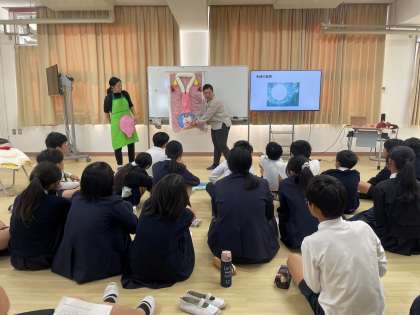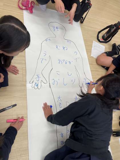 具体物をつかった体や出産のしくみの説明、「体スキャン」という模造紙に体を型取って書き足していくというグループワーク、質問に答える活動など、さまざまな学習活動を設定していただき、子どもたちは興味津々に学んでいるようでした。