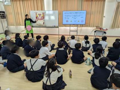 多目的室で命について学習をしました。はじめに卵子の大きさについて学び、0.1mmという大変小さなものから命が始まることを知ると、今の自分たちと比べて考え驚いていました。また産まれたての赤ちゃんと同じ大きさ、重さの人形を抱き上げて、その重さについて深く感じ取っている姿が見られました。はじめて知ることばかりで、興味が尽きない学びの時間となりました。