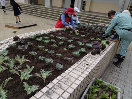 城東区では花を種から育て、苗を様々な施設に提供してくれる取組があります。城東小学校でも以前から行っていたのですが、この度子どもたちや保護者、地域の皆さんにより多く見てもらえるように正門すぐの花壇に花を植えることにしました。