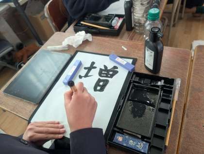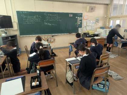 今日の習字は「税」にまつわる言葉を書きました。「税金」「増税」「減税」など、色々な言葉を筆で書きました。今回それぞれのタブレットに表示されたCanvaのスライドをお手本として活用しました。名前も編集可能なので、字の全体的なバランスも確かめやすくなっていました。これからも様々な教科でICTの活用を実践していきます。
