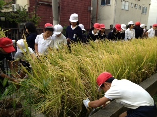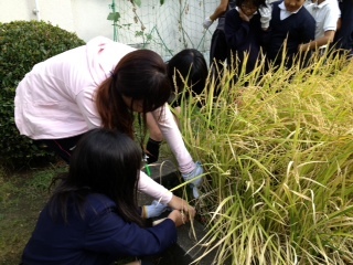 南校舎の裏にある「水田」で稲が育ちました。今日、「稲刈り」をしました。