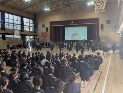 2年生の学年集会の様子です。2年生の子どもたちは今年度取組んだリズムジャンプとダンスを組み合わせて発表してくれました。本番ではほかの学年からも参加者を募り、さらには先生にも参加してもらうことでとても盛り上がっていました。テンポの速い曲のリズムに合わせて色々な跳び方を披露し、ダンスの振り付けも堂々とできていました。素敵な発表を見ることができました。