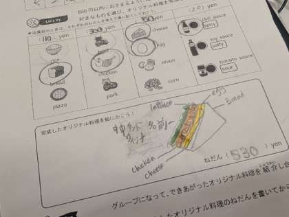現在子どもたちは物の値段を聞き合う学習を進めています。英語でフレーズをたくさん使うきっかけづくりとして、自分でオリジナルの料理を考えて発表するようにしました。材料の値段を友だちと聞き合い、最後には「This is 〜.」と名前や値段を紹介しました。英語を使っての発表は日本語と比べてもなんだか緊張してしまう子も多いですが、少しずつ回数を重ねることで、話すことにも聞くことにもなじんでいってほしいです。
