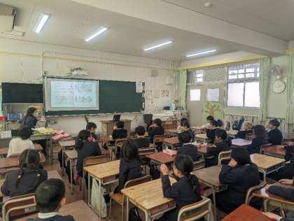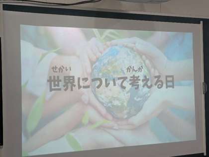 本日1時間目に「世界について考える日」を実施しました。はじめに校長先生より、日本にはさまざまな国や地域から来た人々が多く暮らしており、異なる文化や価値観が共存していることについてお話をいただきました。子どもたちは真剣な面持ちで、その話を聞いていました。