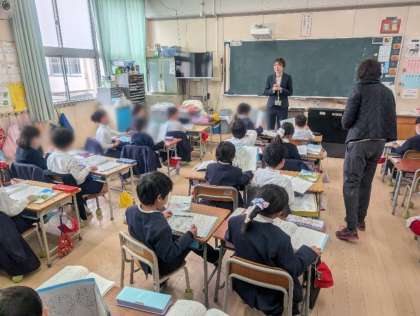 お面をつけて前でスイミーたちになりきっている時には、喜びの気持ちをしっかりと表現することができました。