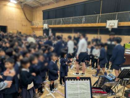 最後は全員で「この地球の続きを」を合唱し、心をひとつにして6年生をお祝いしました。そして、温かい拍手の中、6年生が花道を通り抜けました。これまでお世話になった6年生への感謝と、新たな門出へのエールが込められた、思い出に残る集会となりました。