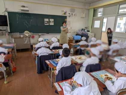 1年生の子どもたちは学校生活に慣れるまで、少し早めに給食を食べ始めています。食缶は6年生の子たちが1年生の教室まで運んでいます。もう少ししたら自分たちで給食を運ぶんだよと先生が言うと、驚いたり早く運んでみたいという子もいました。