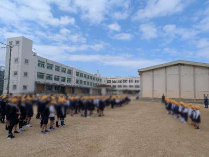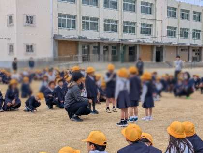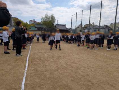 新しい1年生の入学を、学校のみんなでお祝いしました。1年生の子どもたちは6年生の子と手をつなぎ、うれしそうに運動場に出ました。