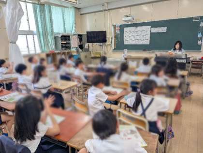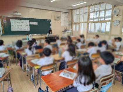 2年生の子どもたちは「BINGO」を英語で歌いました。曲が進むにつれて「BINGO」を声に出すのではなく手拍子で表すことを伝えられると、子どもたちは元気よく手をたたいていました。