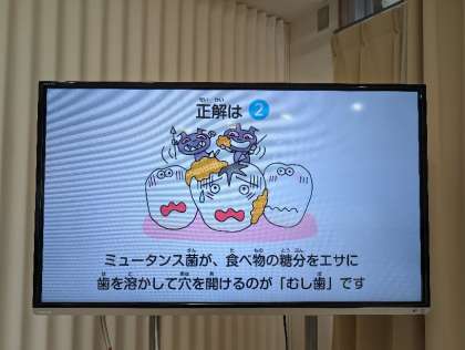 診察を待っている間、モニターに歯の健康にかかわるクイズなどが表示されていました。虫歯のもとになる菌や、歯の硬さに関する問題が出されました。生涯にわたって健康的な生活を送るためにも、小学校の内から健康に関して興味を持ってほしいと思います。