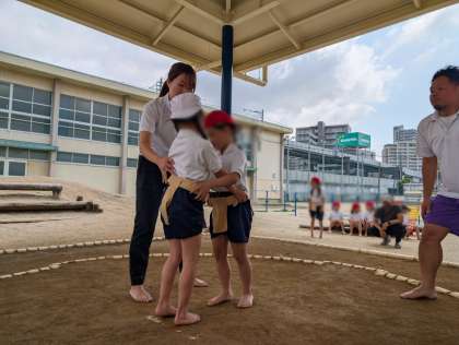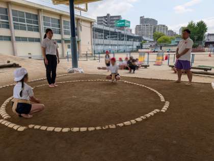 涼しい風が吹く良い天気の中、1年生にとって初めてのすもう大会が始まりました。どの子もワクワクドキドキとした表情で、まわしの準備を進め、いよいよ取組が始まりました。