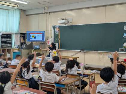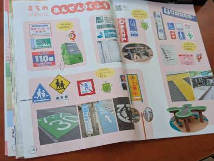 本とモニターに映された画像を使って、町中にある標識などについて確かめました。子どもたちが通学路を歩いていると色々な標識があります。子どもたちはそれぞれどんな意味があるのか考え、クイズ形式で答えていました。生活科は3年生で学ぶ社会科とも密接に関係しています。自分の住んでいる町に興味を持つきっかけにしてほしいです。