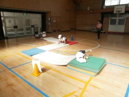 マットを使って、転がったり、逆さになったり。忍者になって、いろいろなコースに挑戦。