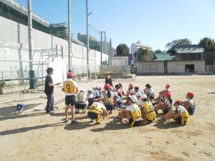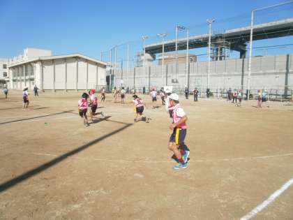 ラグビーのルールでタグをつけてゲームをします。タックルの代わりにタグを取ります。チームで作戦を考えてトライを目指します。