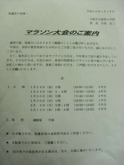1月末から2月のはじめにかけて、学年ごとにマラソン大会をします。応援よろしくお願いします。
