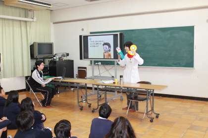 6年生が「くすりの正しい使い方講座」の学習をしました。学校薬剤師の先生から薬を飲むときには「水かお湯」で飲むことなどを教えていただきました。また、「違法薬物」と呼ばれるものは絶対にダメということも教えていただきました。